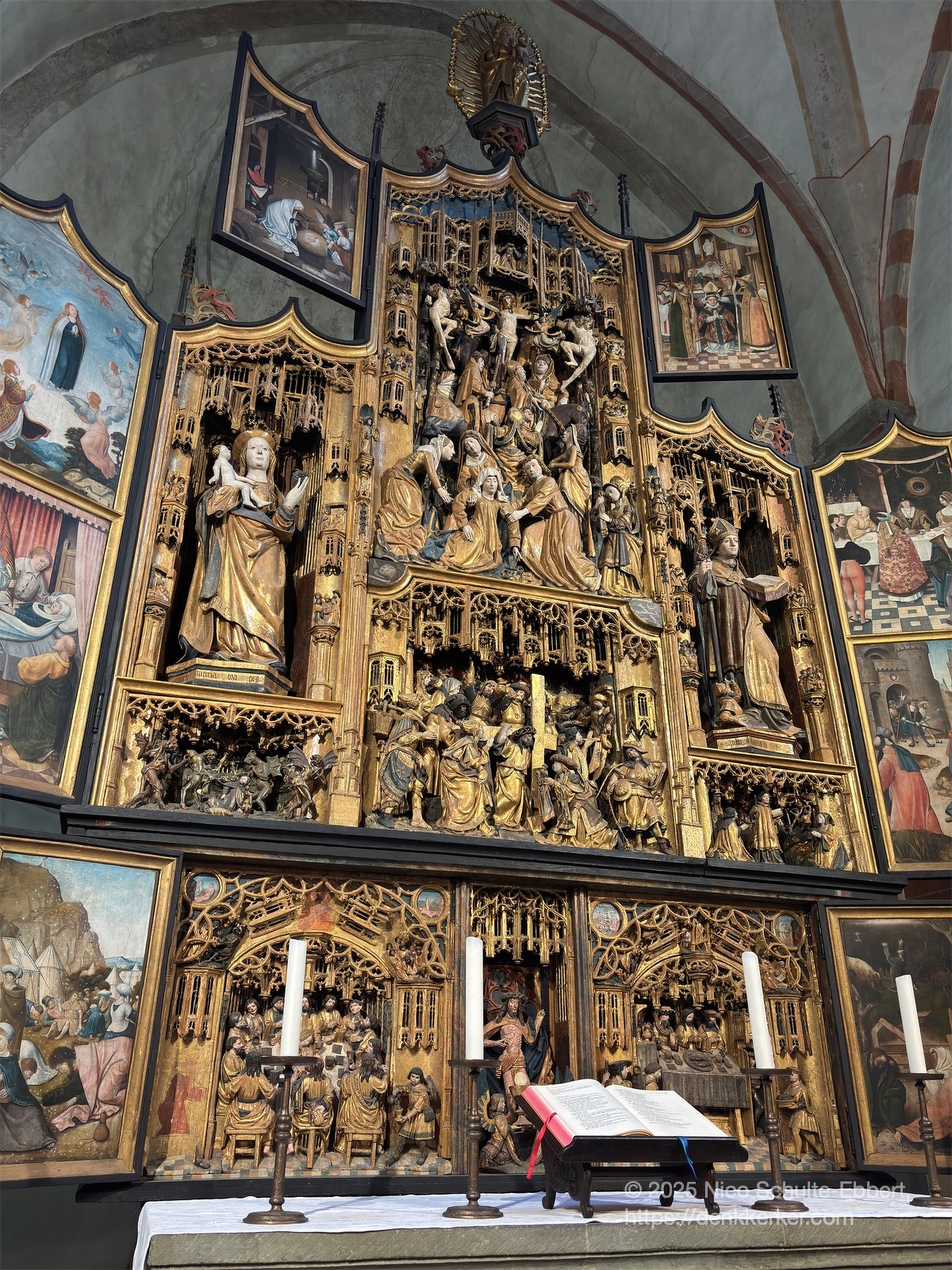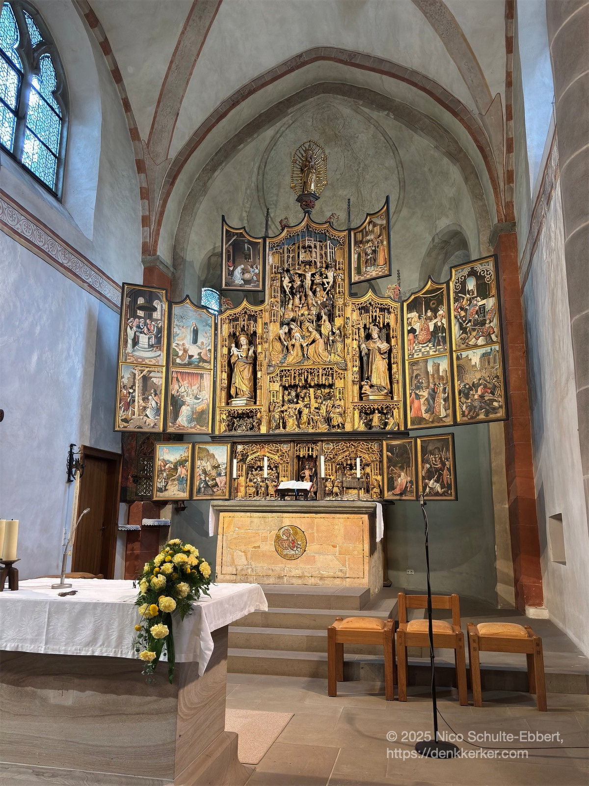 Die spätromanische Hallenkirche Sankt Lambertus wartet mit einem überraschenden Schatz auf: ein prunkvoller spätgotischer Schnitzaltar mit auffallend realistischen, detailierten und figurenreichen Bühnenaufführungen, gefertigt um die Jahre 1515-1520 von Künstlern der Antwerpener Sankt-Lukas-Gilde.