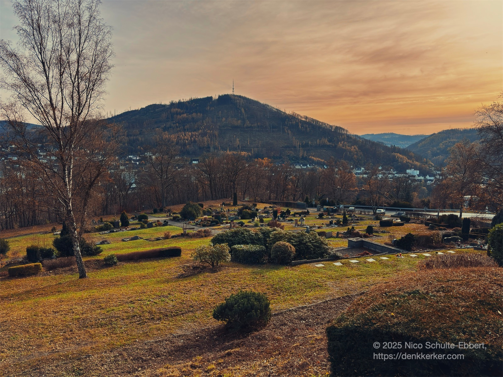 Der Friedhof von Plettenberg-Eiringhausen, auf dem Carl Schmitt beerdigt wurde, mit Blick auf den Saley