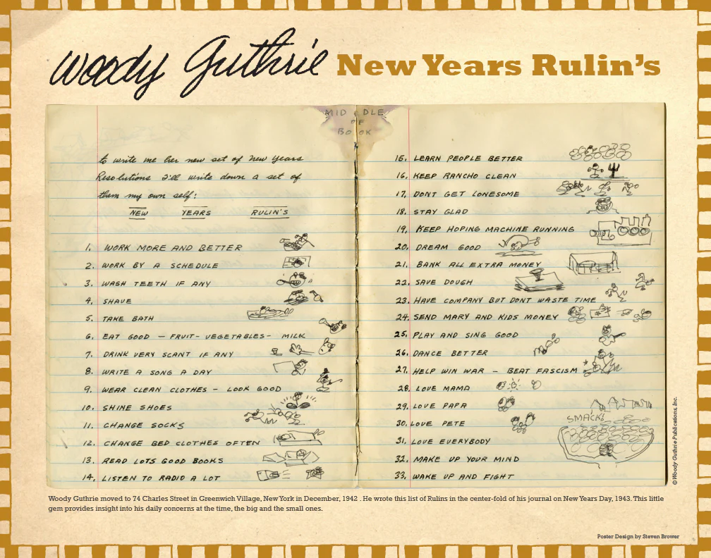 All jenen, die noch Inspiration suchen für gute Jahresvorsätze (New Years Rulin’s), sei die nachfolgende Liste empfohlen, die der amerikanische Folk-Musiker Woody Guthrie (1912-1967) am 1. Januar 1943 in leserlichen Majuskeln in sein Tagebuch notierte.